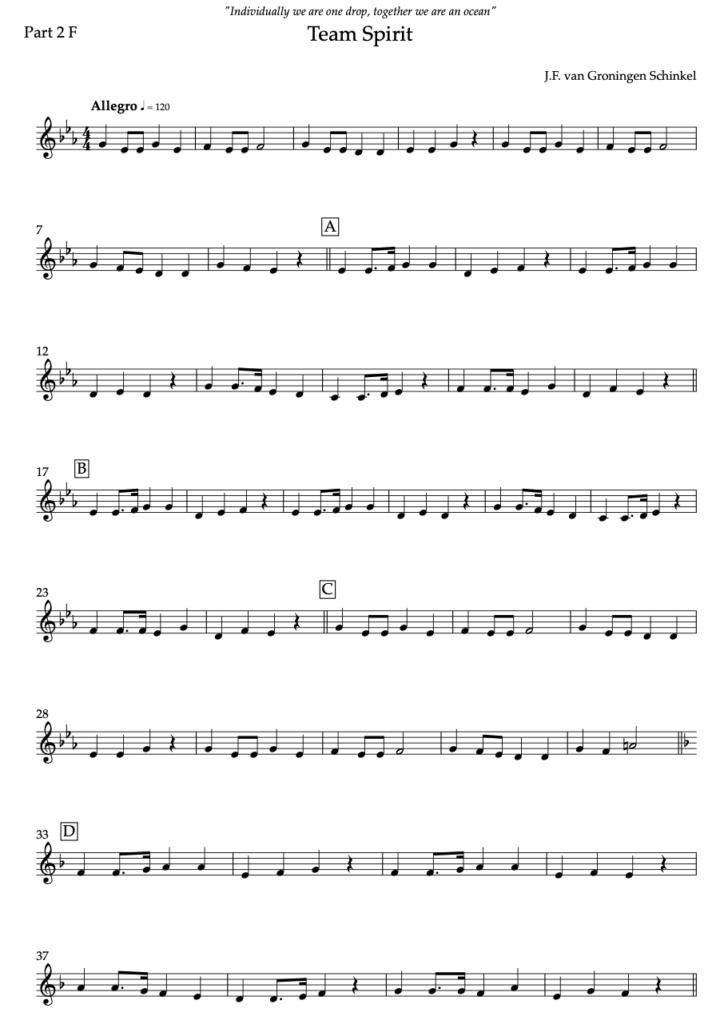 Een vrolijke compositie met een eerbetoon aan alle muzikanten en vrijwilligers die betrokken zijn bij een muziekvereniging. Er is niets leukers dan samen muziek maken! Met twee karakters, een mars en een rock laat componist JF. van Groningen Schinkel (jonge) muzikanten in dit stuk fijn samen spelen. Door de Flex 3 bezetting is deze compositie geschikt voor veel samenspeelorkest, leerlingenorkest en kleinere ensembles.